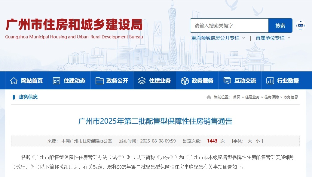 8月8日,广州市住房保障办公室、广州安居集团有限公司发布广州市2025年第二批配售型保障性住房销售通告。